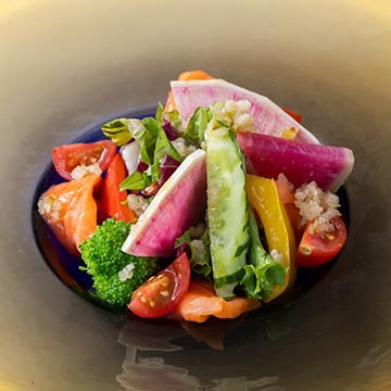信州の食材を中心に使用した和食のおばんざいビュッフェ。長野県産コシヒカリによく合うおばんざいや、季節の炊き込みご飯など日本らしさを感じられるからだに優しい品々が彩り豊かに並びます。松本平で豊富に採れる野菜のサラダビュッフェも充実。ドリンクには信州産100%フルーツジュースを数種類ご用意。